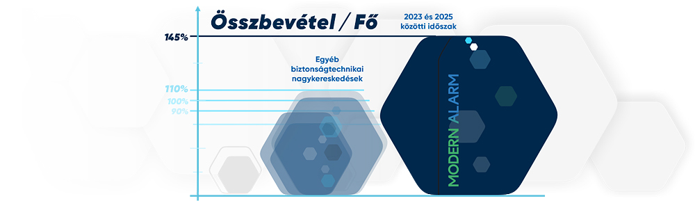 Más, hasonló profilú biztonságtechnikai nagykereskedésekhez mérten, a Modern Alarm Kft. magasan vezet az éves teljes bevétel / fő értékben. Ez a jelzőszám mutatja meg az egyes dolgozók hatékonyságát, amely nálunk kiemelkedően magasan szám.